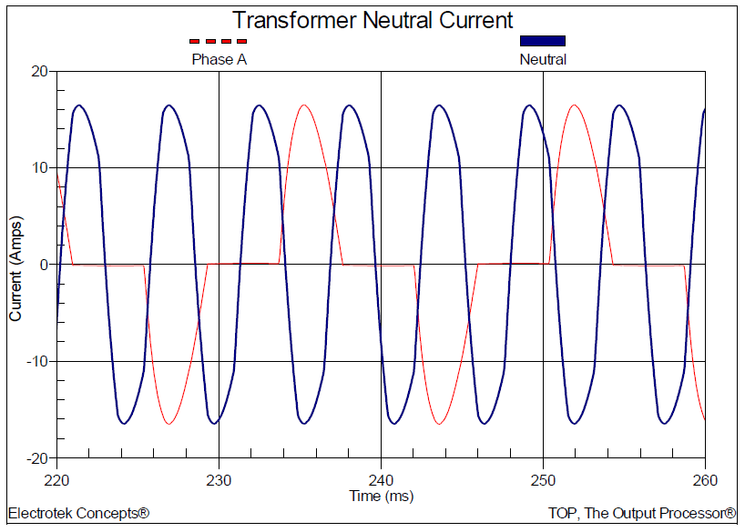 Figure 4 shows the transformer neutral current when supplying the power supply loads. The phase A power supply current is also shown for reference. The triplen harmonics add in the neutral to create a waveform that that consists of mostly 3rd harmonic (180 Hz) frequency. The rms value of the neutral current was 12.72 amps, with the highest components being the 3rd at 12.63 amps, the 9th at 1.41 amps, and the 15th at 0.25 amps. One mistake commonly made with this type of waveform is to use a THD value in percent. This is because the fundamental frequency component of the neutral current in a balanced system approaches zero amps, which leads to a THD value that approaches infinity.