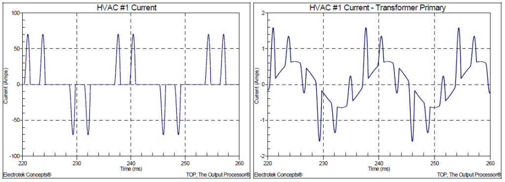 Figure 5 shows the simulated HVAC #1 current and the resulting current on the transformer primary. The secondary current has a fundamental frequency value of 13.10 amps, an rms value of 24.12 amps, and a THD value of 154.58%.