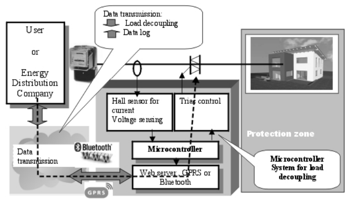 The acquired data including voltage and current values can be transmitted over distance and made available to the interested parties (consumer or electrical power distributor). The necessary condition for data communication is bidirectionality, namely to provide the possibility to remotely control the device by either the client (consumer) or the electrical power distributor. This feature could be useful if the distributor schedules electrical works that could involve potential risks to the consumer (client), by providing the possibility of disconnecting the client over the repair period. The data transmission can be achieved: