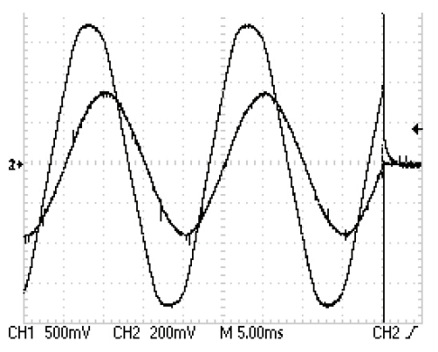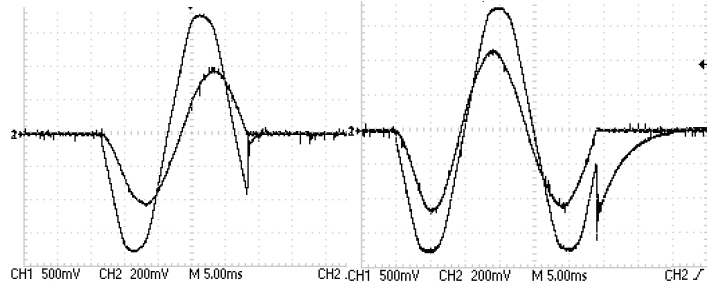 Several measurements were conducted on both constructional variants using resistive and RLC loads for different inductivities by moving the variable core. Some significant waveforms (for several load combinations with limiting values) are presented in Figures 5 and Figure 6. Each graph presents the load voltage (the sinusoid with larger amplitude) and the load current (the lower amplitude sinusoid).