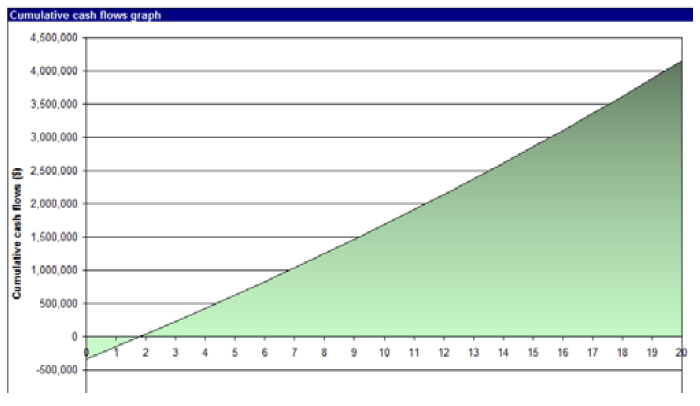 In terms of financial analysis, the total cost of renewable energy is lower than that of non-renewable energy considerably. Even though the renewable system invests much in the construction and equipments, the management and operation cost less relatively. It is assumed that fuel cost escalation rate is 2%, inflation rate is 2%, discount rate is 10% and project life is 20 years , the annual savings and income is 194191$, the net present value (NPV) is 1461288$, the annual life cycle savings is 171642$ and the IRR is 56.7%. At the same time, the benefit-cost ratio is 5.33 and the simple payback is 1.9 yr. In a word, as compared to other systems, its project payback peaks to the maximum, as shown in Fig.14. The financial viability and the cumulative cash flows graph are shown in Fig.15 and Fig.16