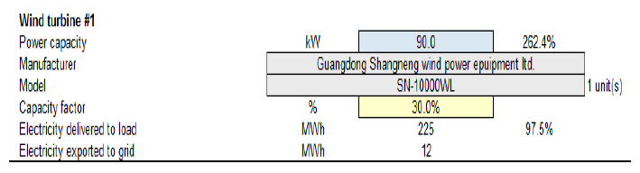 It can be seen clearly from the table that the IRR (56.7%) of the system which using 24 wind turbines is higher than that (52.9%) of the system using 30 wind turbines as a result of the lower cost of the former system. Further more, the percentage of electricity delivered to load is 82.1%, while the net annual GHG emission reduction rises to 211.6t. In terms of the project economic, the proposed power system comprised by 24 wind turbines tend to be the most economical one. More specifically, in this energy model, the percentage of electricity generated by wind turbines and PV generators are 82.1% and 16.2%, respectively. The remaining electricity supplied by fuel generators accounts for 1.6% of the total. The back-up power system made up with batteries is designed in case of emergency. All in all, the energy structure of this power generating system not only make full use of the local wind energy and solar energy, but also improve local conventional power generating system with low efficiency and high cost as well as meeting the demands eventually. The system design graph is shown in Fig.11 and Fig.12.