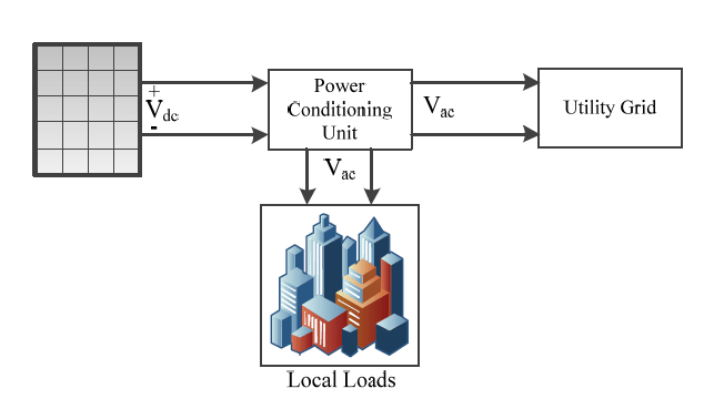 High-penetrated grid-connected PV systems, which are known as a type of DG in the megawatt range, are rapidly developed. These cover the majority of the PV market in different countries worldwide. The main components of a grid-connected PV system includes a series/parallel mixture of PV arrays to directly convert sunlight to DC power and a power-conditioning unit that converts DC power to AC power; this unit also keeps the PVs operating at maximum efficiency [13]. Figure 1 shows the general diagram of grid-connected PV systems. Notably, in many cases, energy storage devices such as batteries and super-capacitors are also considered the third component of grid-connected PV systems. These devices enhance the performance of PV systems, such as power generation at night, reactive power control over the PV systems, peak load shifting, and voltage stabilizing of grids [14].