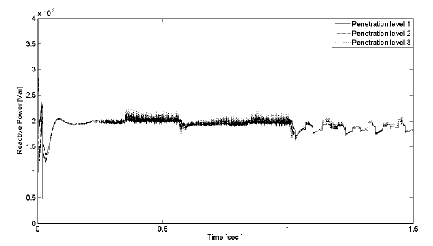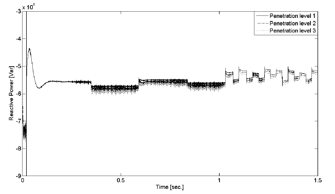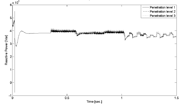 Power fluctuation and voltage variation, which are harmful to sensitive loads, also caused slight variation in total active and reactive power demands of loads, (Figs. 14 and 15, respectively). These variations may cause cable and transformer overloading.