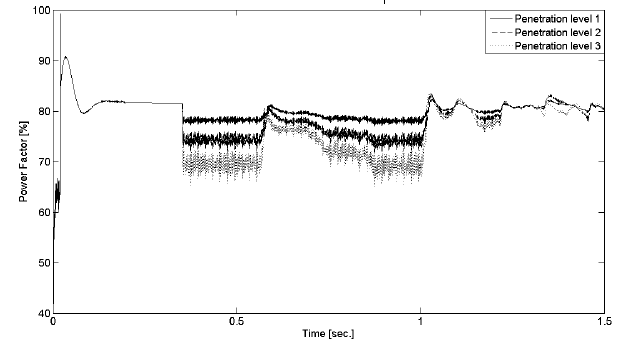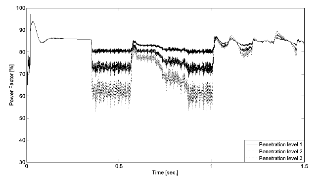 A portion of consumed active power by the loads are covered by the PV system as its penetration level increases, whereas the reactive power consumption continues to be provided by the utility grid (Figs. 5 to 11). Therefore, the power factor of the grid decreases to 70% at 1000 W/m2 solar irradiance. Notably, when irradiance is low, the produced active power of PV unit is low. In this case, the PV unit must draw a very small amount of reactive power from the system because of a small difference between line voltage and reference voltage in the PV controller.