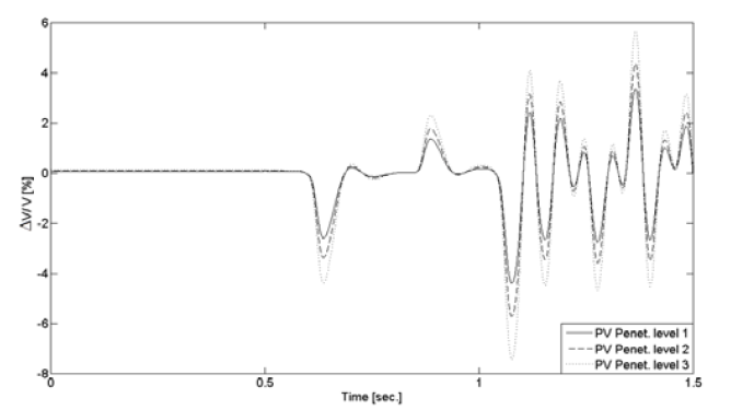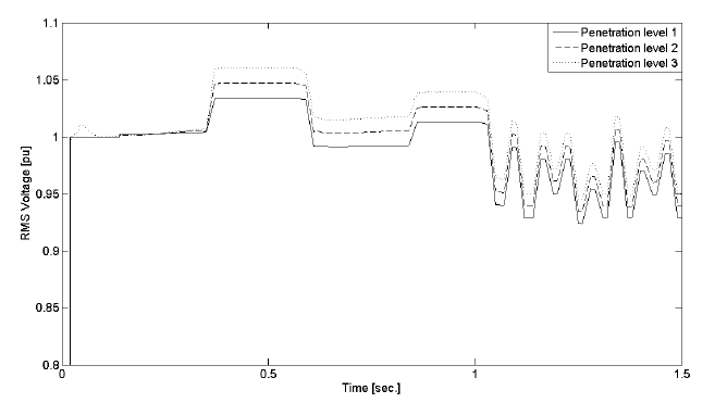 As the penetration level of PV system and the produced active power increases, the system voltage also increases (Fig. 12). Figures 5 and 12 indicate that by increasing the injected active power of PV unit during sunny weather and at high penetration level, the voltage magnitude at bus 6 increases to 1.06 pu, and it is considered as overvoltage based on the IEEE Std 1159-2009 [26]. Voltage flicker occurs at 1000 ms due to the fast power fluctuation of PV together with cloudy weather (Fig. 12). The measured flicker index ( ΔV /V ) at bus 6 under the worst condition exceeds over 6% of its limit as defined in IEEE std 519 [27]