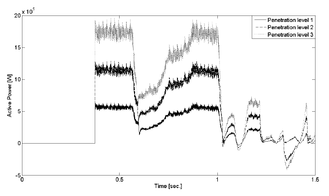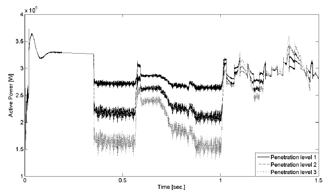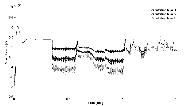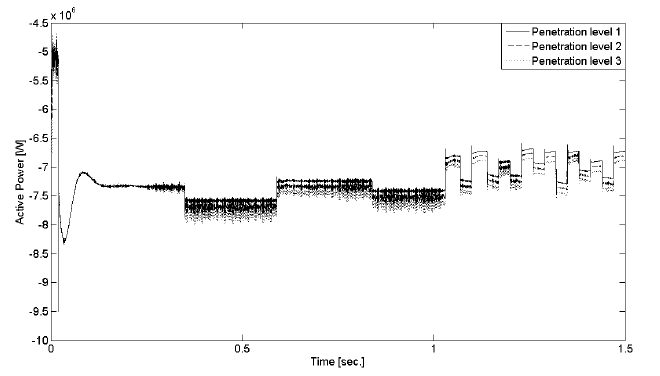 The PV system starts to inject 600 kW power, which is equal to 6% of the total load demand for the first penetration level at 350 ms. In this case, PV continues to feed loads with produced power under 1000 W/m2 solar irradiance until 560 ms. The PV system then feeds through solar irradiance with slow and fast variation at 560 and 1000 ms, respectively. This process is repeated under medium and high PV penetration levels by injecting 1200 kW (12% of the total load demand) and 1800 kW (18% of the total load demands), respectively. Figure 5 shows the injected power by the PV system at bus 11 under these three penetration levels. Figures 6 to 11 show the effect of injected power of the PV system on active power, reactive power, and power factor of utility grid1 and grid2 at bus 1 and bus 2, respectively.