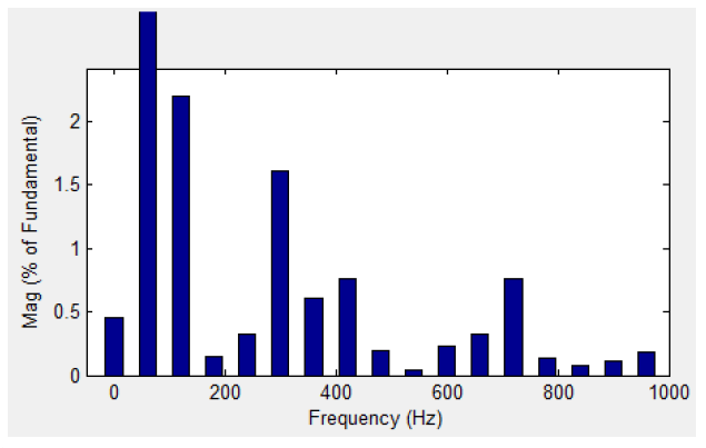 To assess harmonics generated by the PV inverter, the current harmonic spectrum of the current injected by the PV system at bus 11 was measured (Fig. 16). The current THD was calculated to be 15.06%. This value is inconsistent with the THD limit of 5%, as defined in IEEE Std. 519 [27], due to the absence of proper harmonic filter in the PV inverter.
