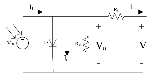 Figure 2 shows the equivalent electrical circuit of a crystalline silicon PV module. In this model, I is the output terminal current, IL is the light-generated current, Id is the diode current, Ish is the shunt leakage current, Rs is the internal resistance, and Rsh is the shunt resistance. In practice, the value of Rs strongly depends on the quality of the used semi-conductor. Therefore, any small variation in Rs value can dramatically change the PV output [15].