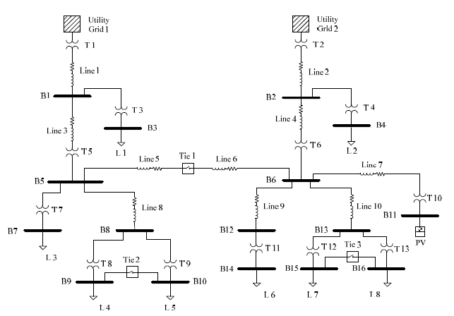 To investigate the various effects of grid-connected PV systems on distribution systems, a modified 16-bus test system [22] (Fig. 3) is simulated using the Matlab/Simulink software. The system, which is fed through two 69-kV utility grids, comprised of eight loads with a total power of 10 MVA and 0.8 power factor and three inter-tie circuit breakers. In addition, a 1.8-MW grid-connected PV system, consisting of three 600-kW units, were placed in bus 11 to provide the required power for local loads and to exchange the rest with the system. Two types of commercial PV arrays, SunPower SPR 305 [23] and Sanio HIP 225 [24], were modeled using company data sheets and the described equations in section 2. The produced DC voltage by each PV array was raised using a 5-kHz DC-DC boost converter. An MPPT [25] is implemented in the boost converter to efficiently control photovoltaic energy conversion. Furthermore, the boosted DC voltage is converted into AC voltage using a three-phase three-level VSC. In this analysis, the required information related to solar irradiance under different weather conditions within a year were collected from the MMD [12] and were mixed to create different solar irradiances for sunny and different cloudy weather conditions with slow and fast variations (Fig. 4).