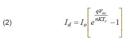 where Io is saturation current of the diode, q is electron, n is curve-fitting constant, K is Boltzmann constant, Tr is temperature on the absolute scale, and n is the ideality factor, whose value is between 1 and 2.
