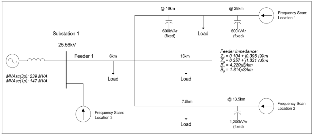 The effect of seasonal load variation on the frequency response characteristic of a 25.56kV distribution feeder was studied for the system shown in Figure 1. The accuracy of the system model was verified using three-phase and single-line-to-ground fault currents and other steady-state quantities, such as capacitor bank rated current and voltage rise. Frequency scan analysis was used to determine the impedance vs. frequency characteristic for the feeder for various operating conditions.