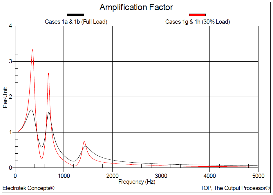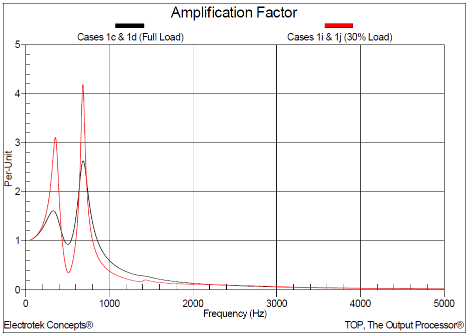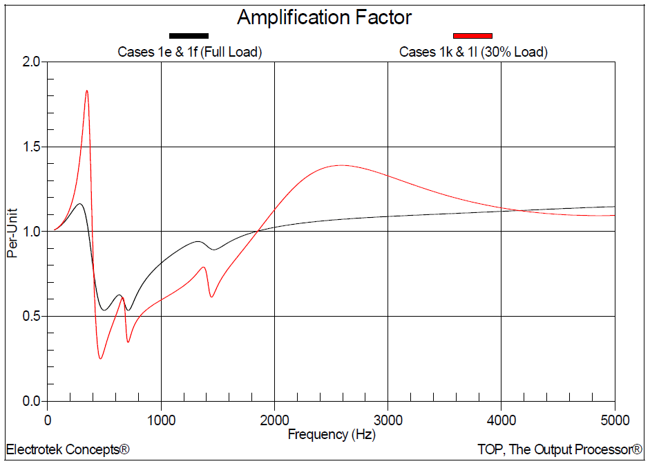 Figure 8 shows the amplification factors for scan location number 1 (600kVAr) for the full load and 30% load conditions. Amplification factor is defined as the ratio of impedance with capacitor banks to the impedance without capacitor banks (e.g., Case 1b divided by Case 1a).