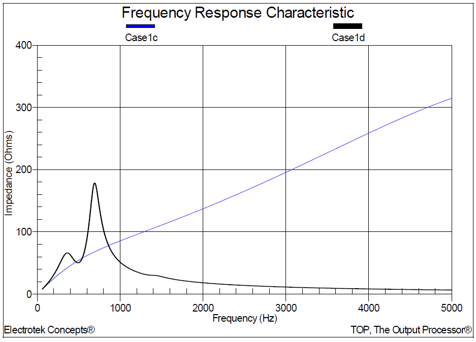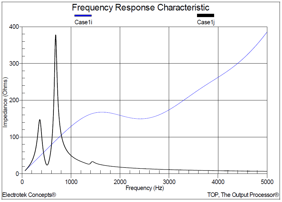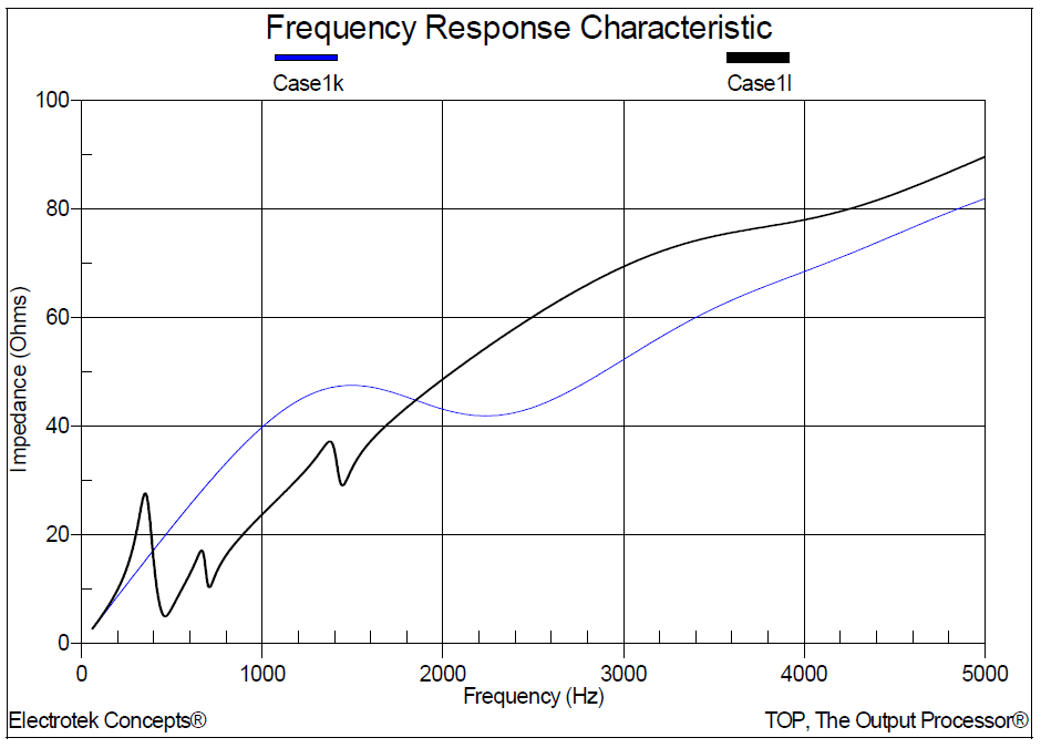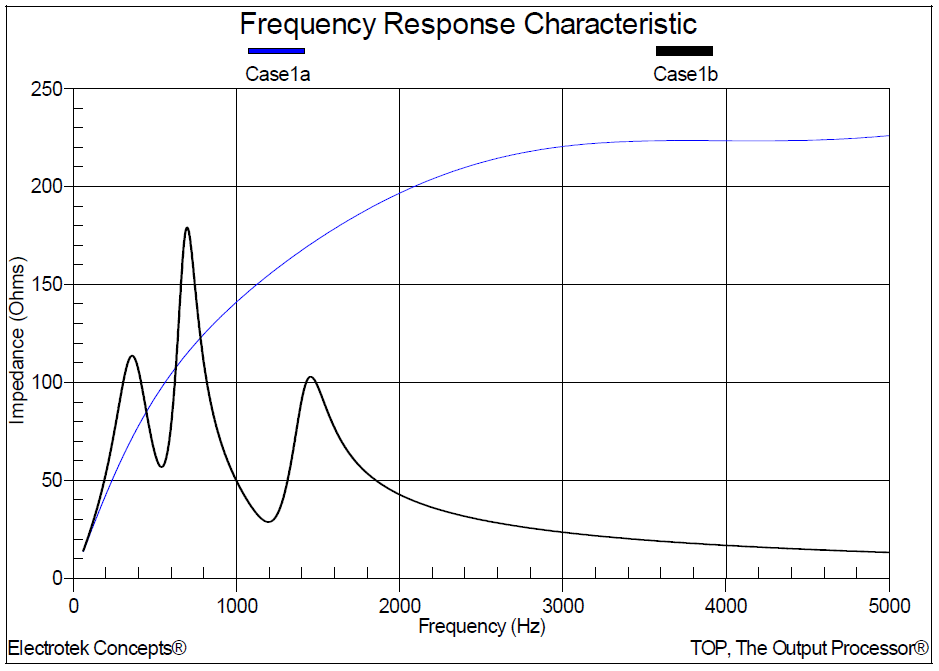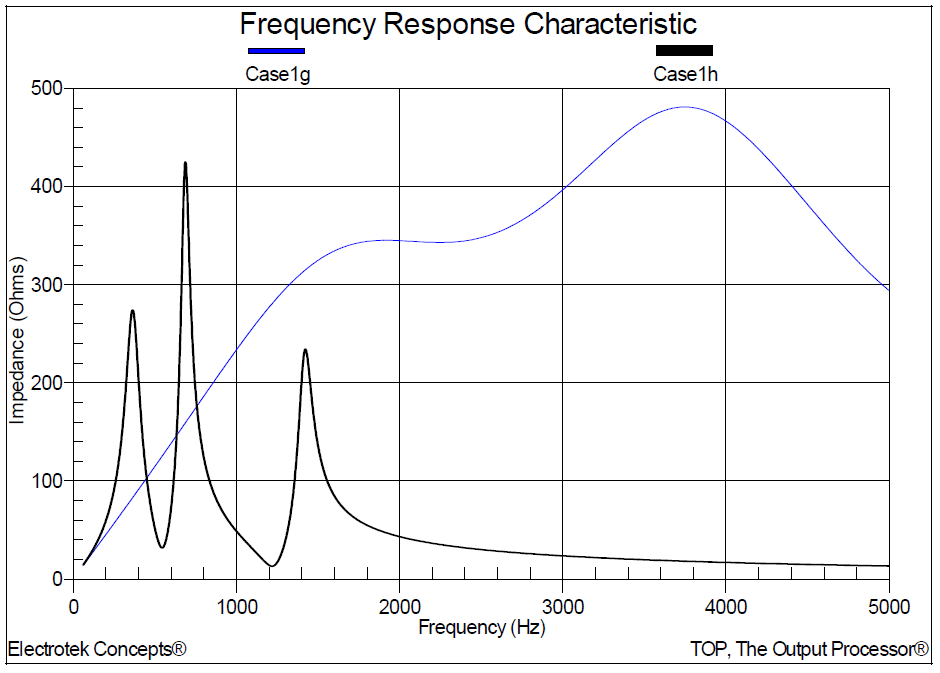 1. For scan location number 1, the simulated parallel (high impedance) resonant frequencies were approximately 360 Hz, 700 Hz, and 1420 Hz. The series (lower impedance) resonant frequencies were approximately 540 Hz, and 1,200 Hz. The amplification factor range was between 0 and 3.4.