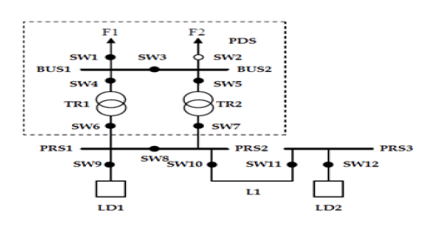 The system architecture of power grid is shown in Fig 1. It contains one PDS (Power Delivering Station) and two PRS (Power Receiving Station). In Fig. 2, F1 and F2 denote Feeders F1 and F2, SW denotes switches, LD denotes load delivering station and TR denotes transformer. If fault occurs in F2 due to overload the SW2 will be opened by manual operation. After this SW3 will be closed (normally open condition) to deliver the power to the affected area of F2. If fault occurs in F1 the vice versa will happen. Because of this resource sharing is taking place which makes the balancing of the power system’s load.