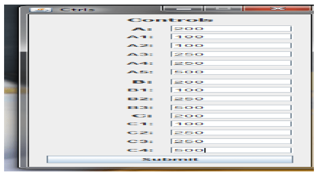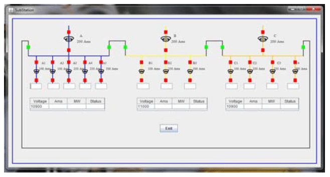 This is the load-setting page for breakers and transformers. In Fig. 10, Values are assigned as given in the Screen shot. In this box A, B and C denote Feeder Breakers. A1–A5, B1–B3 and C1–C4 denote the corresponding transformers. For all the feeder breakers the maximum power of 200 Ams is assigned. After setting the load in the box the below substation diagram (Fig. 11) is obtained. The values are reflected in the diagram.