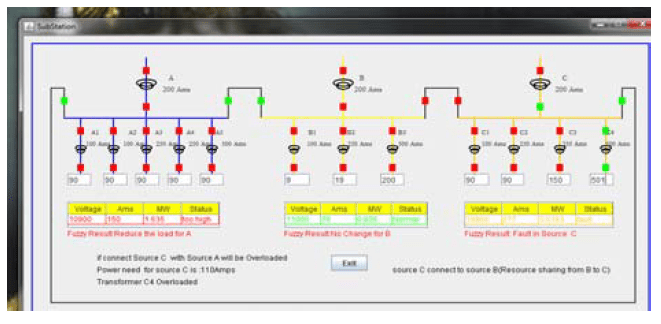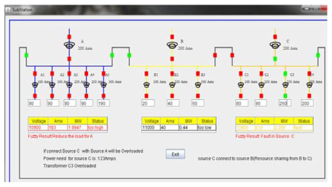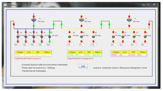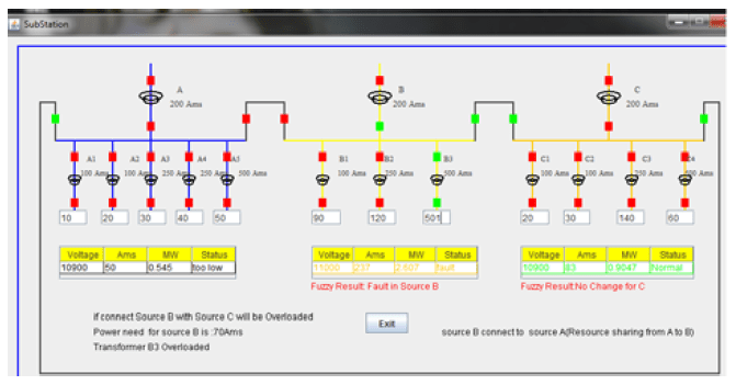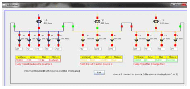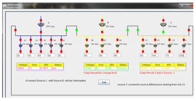 Voltage in column one of table indicates the incoming voltage of Substation A, i.e., source A, Ams indicates how much load is utilized by the connected area of Source A. The Ams is calculated by adding all transformers current values divided by 3 which means if the current in the breaker relay shows 1 Ams the line will carry 3 Ams. But in the actual substation if the line carries 300 Ams the current in the breaker relay shows 1 Ams. The Ams present in the table will be compared each and every time with the Feeder Breaker Relay Ams wherein Fuzzy calculation is implemented to estimate the line current to reduce the fault, Load and share the load to the affected area. It helps the Operator for quick Operation and avoids the Power interruption and Power Losses. MW is calculated by multiplying the voltage and Ams it informs the operator how much amount of MegaWatt is delivered /received to/from the affected area. Status column indicates the present status of the load from which the operator can easily take the decision. Fault is created in Source A and power is supplied to the affected area of Source A by resource sharing from Source C. Source B will be overloaded if affected area of Source A is connected to Source B.