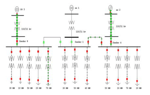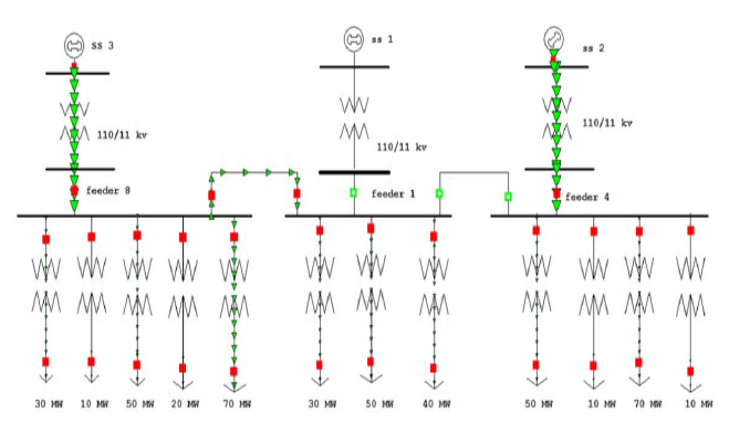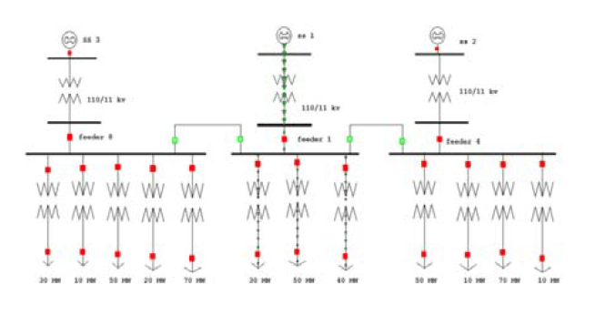 It includes a number of substations interconnected together and each substation is having power transformers, breakers and isolator switches through which power sharing is done.