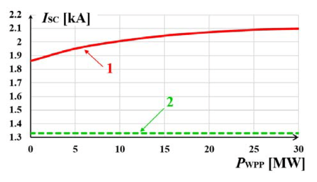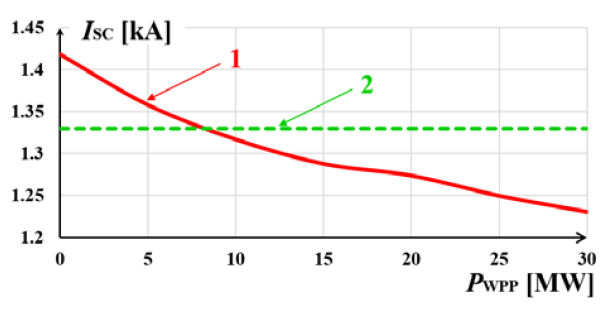 Experiment №2 – Three-phase-to-ground short circuit at Node 13 with a change in capacity of WPP (from 0 to 30 MW) at Node 14. In this case, it can be seen an increase in the value of short-circuit current flowing through the L-17 (Figure 8) with an increase in WPP capacity.