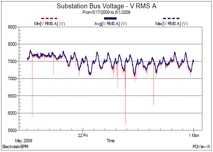 Figure 1 shows the measured rms voltage regulation trend on the 12.47kV substation bus during the two-week period. Various pole-mounted distribution feeder capacitor banks (e.g., 600 kVAr) are switched on-and-off each day using time clock controls in an attempt to maintain a relatively constant voltage. Statistical analysis of the measurement data yields a minimum rms voltage of 12.27kV, an average voltage of 13.02kV, and a maximum voltage of 13.56kV. In addition, the CP95 value was 13.39kV. CP95 refers to the cumulative probability, 95th percentile of a value.