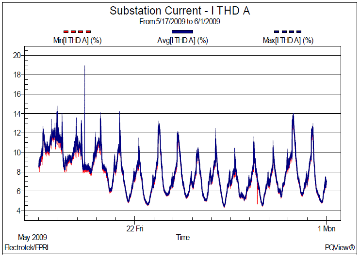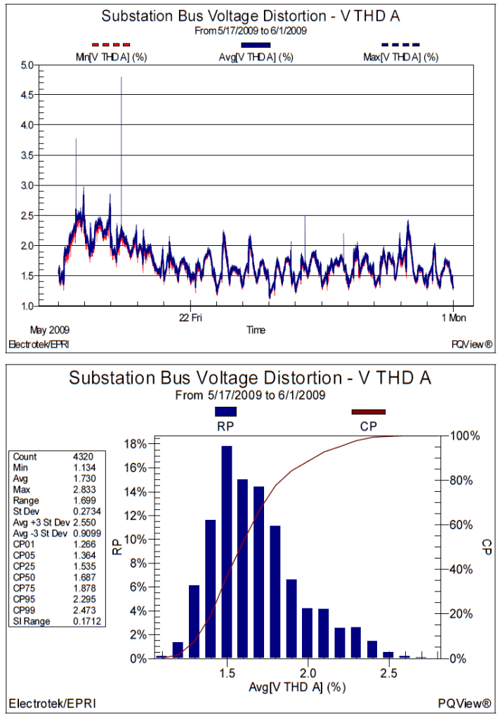 A harmonic measurement analysis case study was completed for a 12.47kV utility substation bus. The two-week monitoring period was from May 17, 2009 thru June 1, 2009. The power quality instrument used to complete the harmonic measurements was the Dranetz-BMI Encore SeriesTM. The instrument samples voltage at 256 points-per-cycle, current at 128 point-per-cycle, and follows the IEC 61000-4-3 method for characterizing harmonic measurement data. This involves analysis of continuous 200msec samples and storing aggregated 10-minute minimum, average, and maximum trend data. The measurement and statistical analysis was completed using the PQView® program (www.pqview.com).