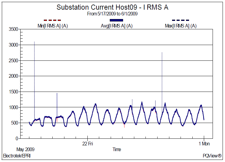 Figure 3 shows the corresponding rms current trend. Statistical analysis yields a minimum current of 378A, an average current of 690A, and a maximum current of 1165A. CP95 value was 1014A.