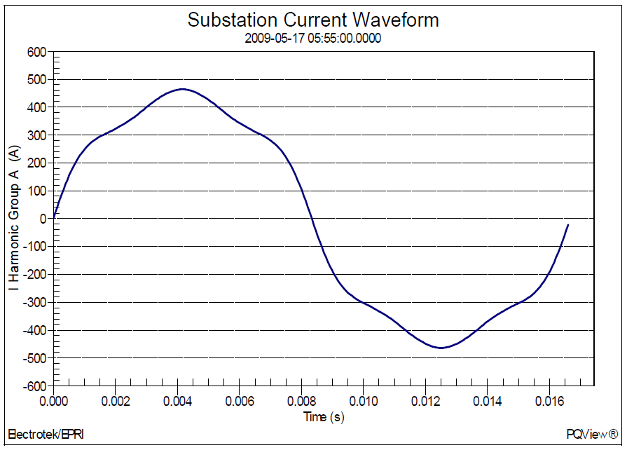 Figure 7 shows one sample calculated harmonic current waveform from the measured harmonic spectrum data. The waveform was created using an inverse DFT with 256 points per cycle. The fundamental frequency current value was 469A, the rms current value was 472A, and the current distortion was 11.8%.