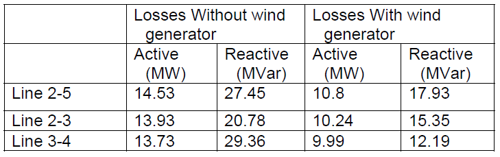 The table 3 shows the active and reactive power loss with and without generator wind.