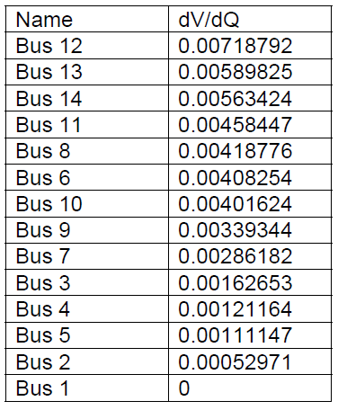 Table 5 shows the voltage sensitivity when we injected a reactive power. We can see different values, 0 in the slack bus (because the slack-bus has constant voltage) . The most sensitivity bus is bus 12 (0.00718792). If the SVC is installed in this bus, it will inject a reactive power which can be help to improve the voltage at the critical buses.