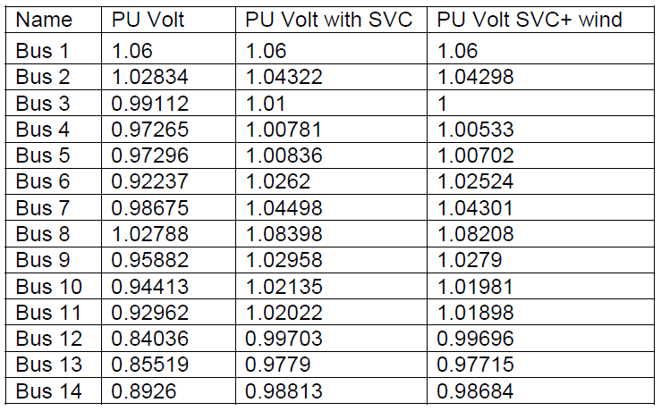 The SVC is used to limit the transfer of reactive power for reduce the drop voltage. The optimal location of SVC is very important for improving the security of power system. When the SVC placed at bus 12 and changed the generator at bus 3 by wind generator, it can see that the reduction of voltage with small value of each bus , because of the variation of frequency due to the variation of speed of turbine generator.