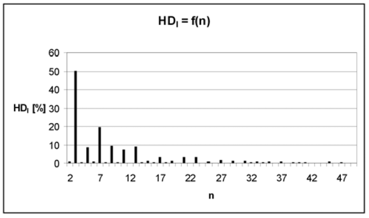 The contribution of each harmonic in the final shape is defined as an individual signal distortion factor HD (current or voltage) and is calculated from the formula: