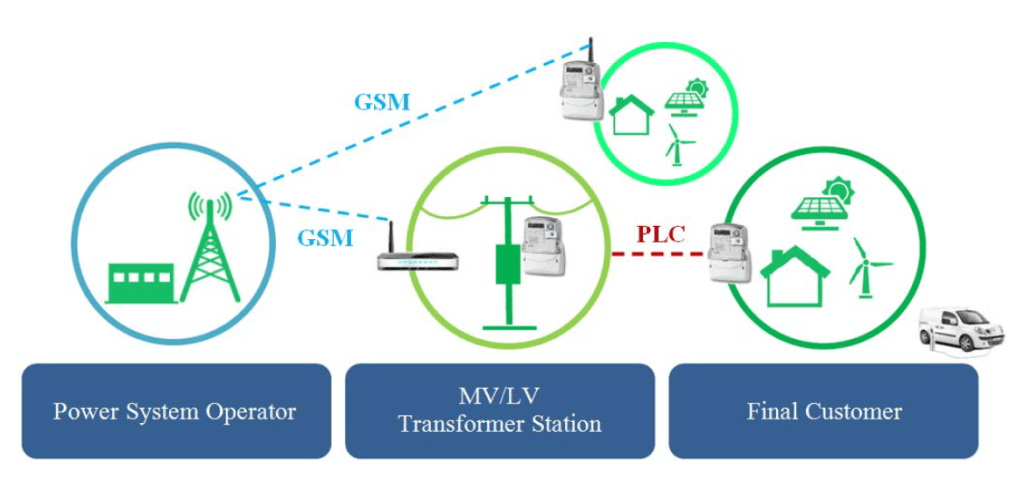 The most important difference between the smart and the conventional metering system is the implementation of a two-way communication between a meter and a power system operator, enabling a complete automation of the electricity settlement process [4]. Achieving the two-way communication is not possible with commonly used analog electricity meters. This effect can be accomplished only by the use an electronic, equipped with communication module meter – called a smart meter. A meter-MDM communication can be done in two ways – directly using the GSM network or indirectly through a collecting device called a data concentrator. Most of the present methods based on the solution using the concentrator. The concentrator is generally placed in a MV/LV transformer station and it is responsible for a multiple meters communication with the MDM. A meter to concentrator communication is realized by using the power line communication (PLC). Measurement data from the concentrator is then routed to the connected communication module, linking with the MDM via GSM [5]. All of these devices and communication methods are parts of the AMI, which simplified structure is shown in figure 1.