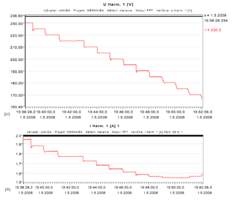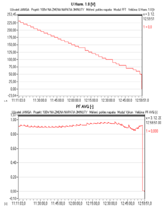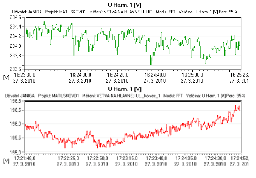 From measurements performed in Matúškovo it can be seen that at the end of the line voltage was out of the boundaries of EN 50 160. Although at the beginning of the branch is almost nominal voltage. This situation occurs when at the beginning of the line is almost nominal voltage. This network has been just before reconstruction and almost half of the lights have been broken. Some lamps have been connected to another phase, but it is expected that already during the construction of the network with a 250 W mercury lamps.