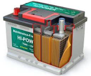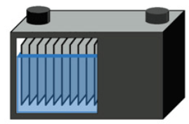 It is the oldest type of batteries, the cheapest and the most widespread. It is called “liquid” because the conductive material between the anode and cathode plate is a liquid substance, which is sulfuric acid diluted with water, concentration ratio 3:1. Flooded batteries need maintenance, which includes replacing the acid and adding distilled water once or twice a month to compensate for the water evaporating from the batteries. Figure 4 demonstrates the components of a single cell of a flooded battery, which consists of sponge lead which represents the cathode electrode and a clip of lead, and behind the clip a plate of dioxide Lead, which represents the anode electrode, and these cells are immersed in acid diluted with water.