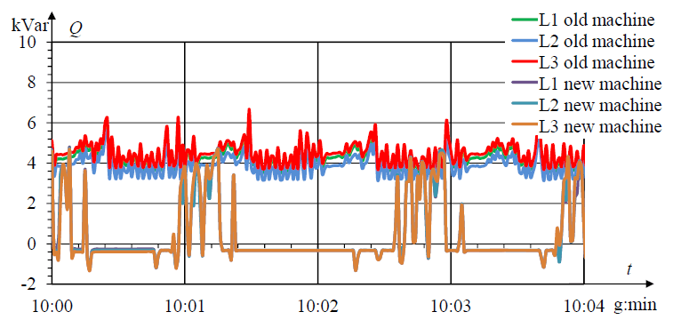 – reducing the consumption of active power (Fig. 6) and reactive power of the basic harmonic (Fig. 6) and, in consequence, reduces the consumption of electrical power from 13.36 kWh to 3.02 kWh per hour of machine operation.