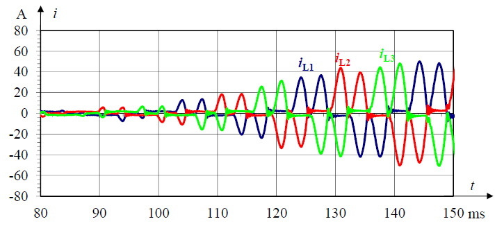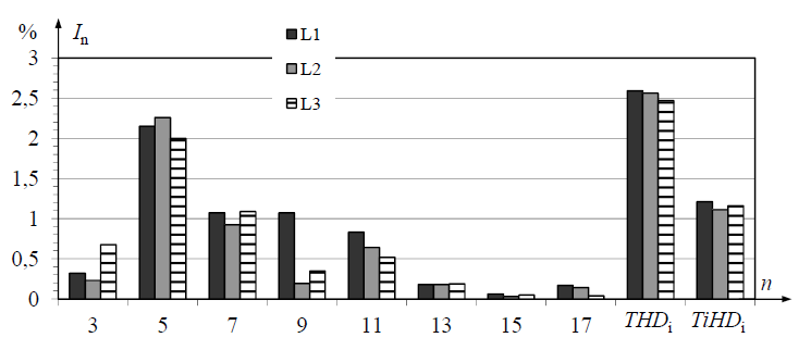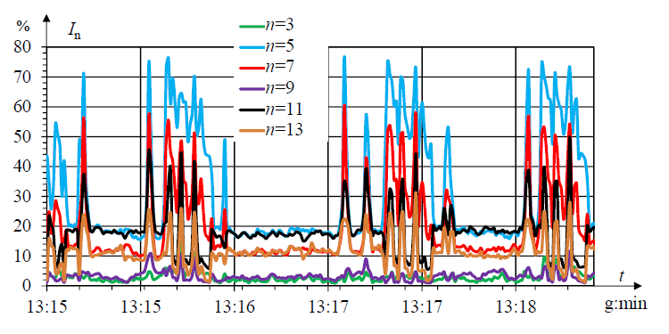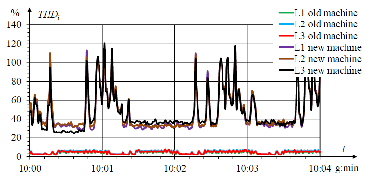 Their value does not exceed 20% for the specific harmonics and 40% for THDi. The values of specific harmonics increase significantly when the engine is activated, reaching 70% for the 5th harmonic and 50% for the 7th harmonic. The total value of the higher harmonic in the current powering the machine then reaches 120%. In similar operating conditions with the older machine, the content of higher harmonics in the feeding current did not exceed 8% (Fig. 12).