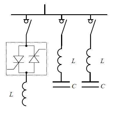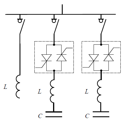 The second system (SVC) consists of a throttle activated by the thyristor switch and condenser activated by the contactor of the switch (Fig. 15). In this solution, it is the condenser that is permanently connected to the network and the throttle controlling the thyristor activation angle adjusts the reactive power of the basic harmonic supplied to the network. The condenser power should be adapted to the maximum values of the inductive reactive power of the basic harmonic consumed by the engine drive system during its operation. The throttle should be selected in such a way so as to compensate only the reactive power of the basic harmonic generated by the condenser.