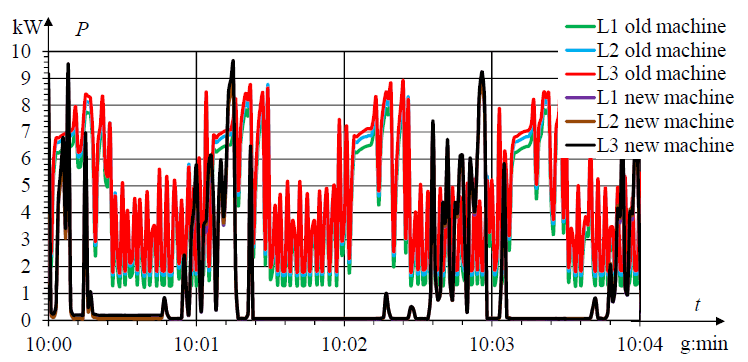 To analyse the energy consumption level and the quality of energy consumed by the machines, measurements with a HIOKI 3196 type power supply quality analyser were performed. During device operation, current, voltages and power were measured to determine energy consumption levels along with higher harmonic currents and voltages in the power supply point. Both machines had the same technological parameters.