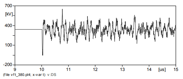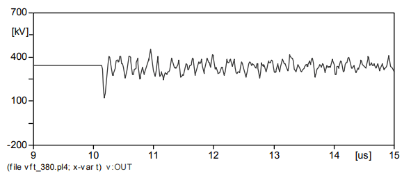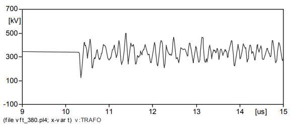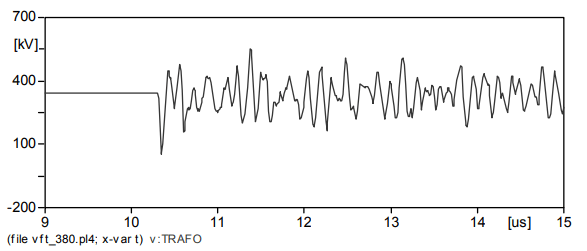 As it is visible in all figures representing VFT overvoltage waveforms, disconnector have been closed at time instant of t = 10 μs. All overvoltage waveforms are characterized by multiple wave reflections resulting with very high frequencies in the range of 6 MHz to 10 MHz. In figures 5 and 9 it can be observed, that the disconnector load side is preloaded with trapped charge equal to -0.5 p.u. and -1 p.u. respectively. In figures 8 and 11, where voltage waveform at transformer HV terminals have been represented, one can observe, that the overvoltage wave is delayed in time of 300 ns from the assumed disconnector closing time instant of 10 μs. This can be explained with the fact, that overvoltage wave propagates along entire GIS substation from the operated disconnector up to the transformer. Since this distance is equal to 86 m wave propagation speed can be easily calculated to 286 m/μs, which corresponds very well with assumed value of 290 m/μs. These values differ due to the presence of GIS equipment capacitances that smooth the overvoltage wave.