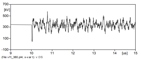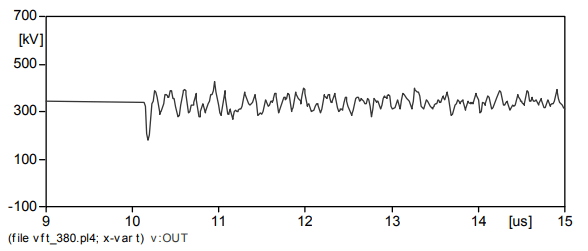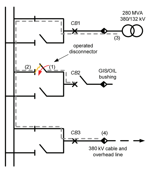 Singular switching operation (closing) of the disconnector have been simulated in EMTP/ATP software. As it is visible in Figure 3, circuit breaker CB2 is open during entire process of disconnector closing event, whereas circuit breakers CB1 and CB3 are closed and provide current path, which have been marked with dashed line. For the worst case operating conditions it has been assumed, that system is working at maximum allowed power frequency voltage (420 kV) and at the switching time instant source side voltage is at its maximum (+1 p.u.).