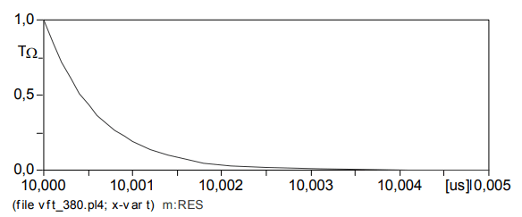 As it was described, the disconnector closing event was modeled as an exponentially decreasing resistance. For this study, this operation was issued at the time instant of t = 10 μs. The nonlinear resistance decreases from very high value to 0.5 Ω in about 4 ns (Fig 4). This behavior is independent from value of trapped charge voltage, thus it is the same for both cases with -1 p.u. and -0.5 p.u.