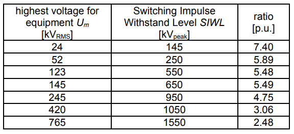 Table 1. Comparison of ratio between highest system voltages and their maximum switching impulse acceptable levels