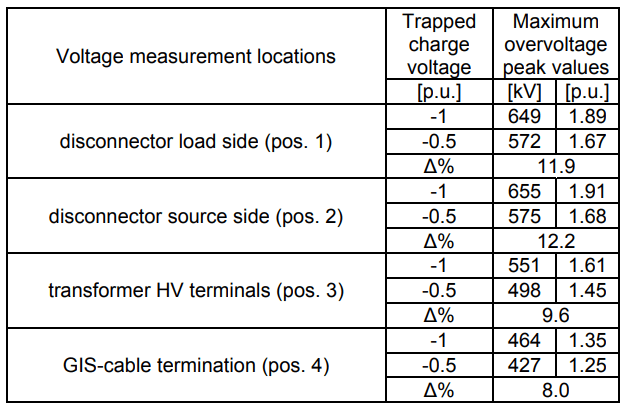 As it has been presented in Table 3, the highest overvoltage peak value occurred at the operated disconnector terminals and is equal to 655 kV, which reaches level of almost 2 p.u. It can be also observed, that overvoltage magnitude decreased during propagation through the entire GIS substation. At the transformer terminals its peak value is equal to 551 kV, whereas at GIS extraction point it decreased to 464 kV. Once the overvoltage wave extracts out of the GIS, it is very quickly dumped on substation overhead connections and high voltage cables. Such behavior is visible for both analyzed cases, that is with -0.5 p.u. and -1 p.u. of trapped charge voltage at disconnector load side. However, as it have been expected, calculated maximum overvoltage peak values are significantly lower with smaller trapped charge. Calculated voltage difference is in the range of 8.0 – 12.2 % and it is an obvious reason why during the typical insulation coordination studies all of the analyzes should be performed with -1 p.u. of assumed trapped charge voltage.