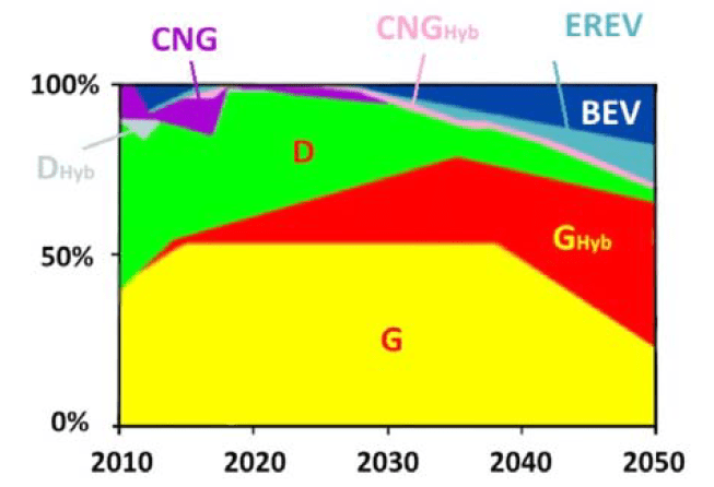 – The Institute of vehicle concepts (DLR) has developed a computer based scenario model (VECTOR21 (Fig.2)) to predict market shares of new power train concepts (HEV, BEV FCV etc.) for Germany between 2010 and 2030,