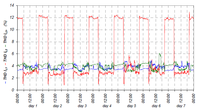 The relative values of the higher current harmonics of the order n = 2,…,40 were found and referred to the fundamental I1 ref. No significant change in the degree of current deformation was found to be dependent on the variation of power generated by the PV system – figure. 7. The steep increases in THD I up to 12.89% visible in figure 7 were caused by current received by nonlinear sources of light, switched on during nighttime and supplied from the phase L2 circuit. Figure 8 presents relative values of current harmonics determined at Pmin. As these values indicate, the phase currents are deformed only to a slight extent. The harmonics of the order n = 3, 5, 7, 9 are dominant.