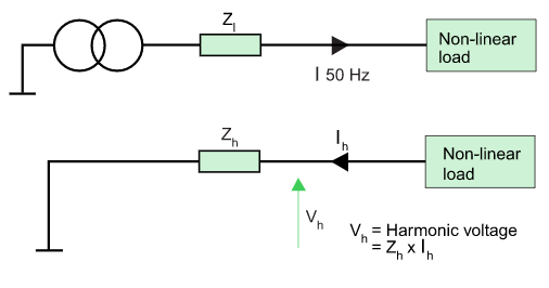 When the harmonic current of order h flows through impedance Zh, it creates a harmonic voltage Uh, where Uh = Zh x Ih (by Ohm’s law).