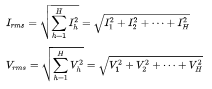 The r.m.s. value of voltage and current can be calculated as a function of the r.m.s. value of the various harmonic components: