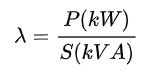The power factor λ is the ratio of the active power P (kW) to the apparent power S (kVA).