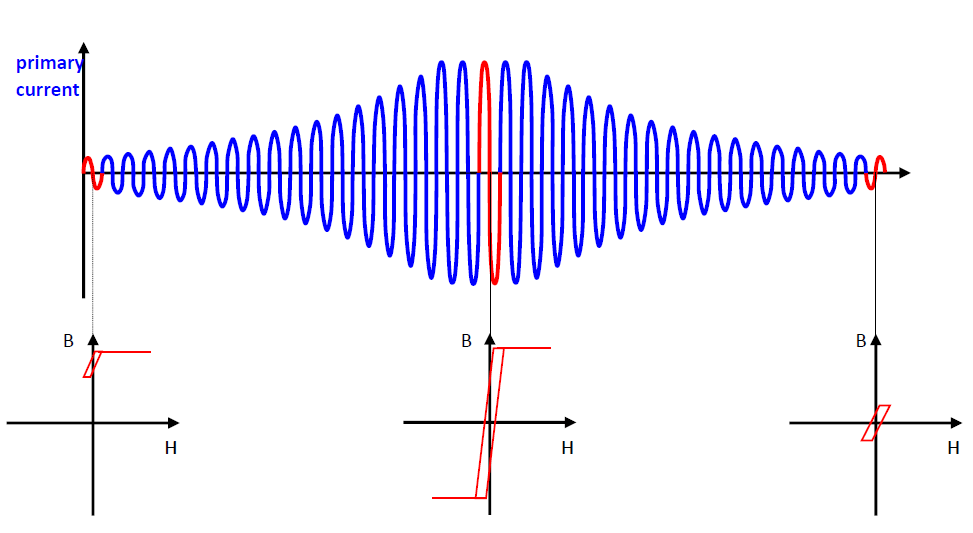 While in the literature current transformers are said to have a much better frequency response than voltage transformers, switching operations can cause the iron core to have residual magnetization. The reason for this is that the current is switched off at zero crossing. At this point, the magnetic flux density is exactly at its maximum due to the 90° shift. Particularly in the case of hard magnetic core materials without following excitation with the entire rated primary current and full burden power, the hysteresis curve does not always return to the starting point.11 The current transformer remains in a magnetic operating range which has not been specified and tested.12