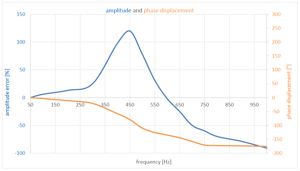 Already at approx. 450 Hz, a harmonic amplitude could be amplified by a factor of 2.2 (see Figure 4). Amplitude errors of approx. -75 % have also been measured below 1000 Hz in other devices.6